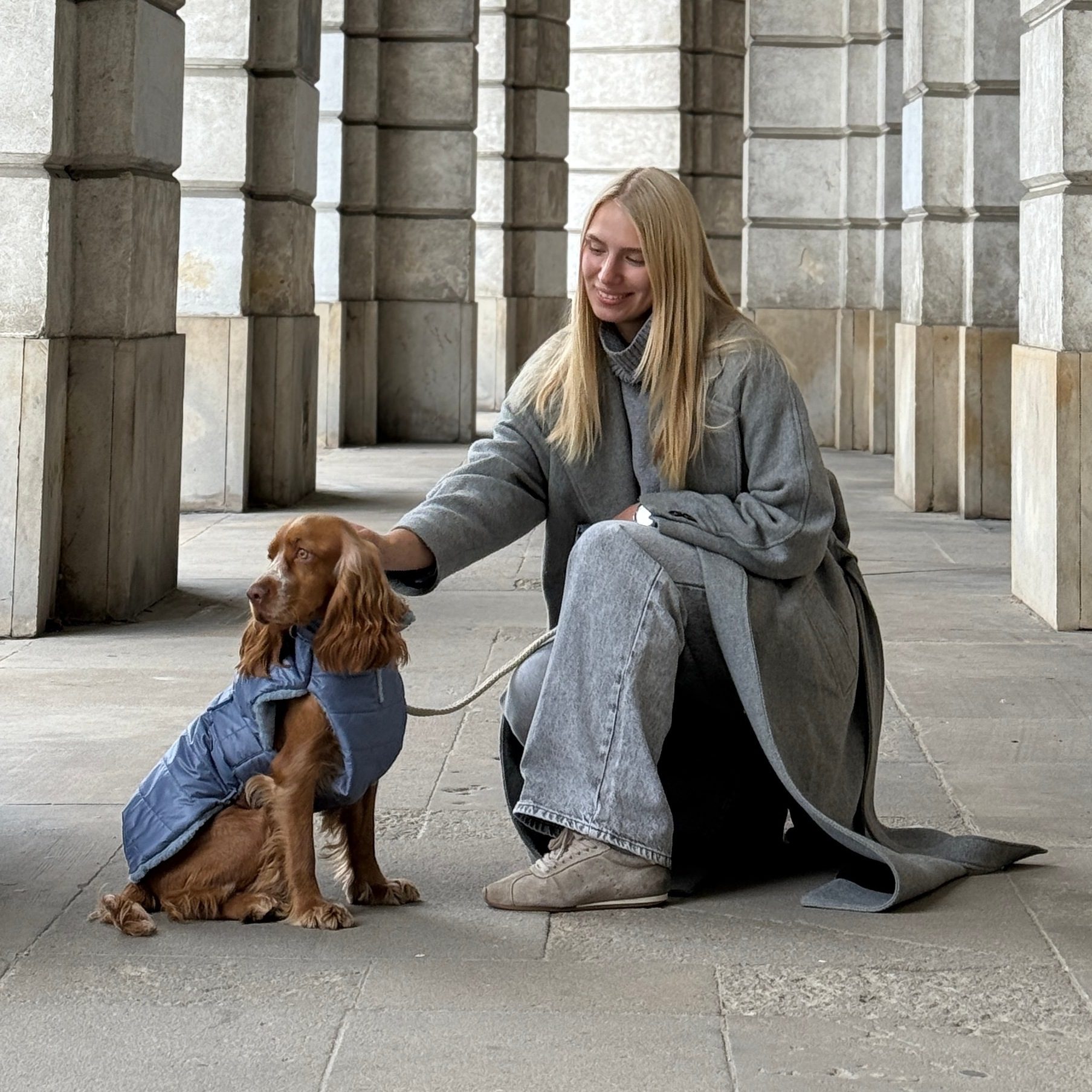 Odpinany kaptur pozwala dopasować model do pogody, a krój skutecznie osłania brzuszek i klatkę piersiową. Na karku znajduje się dyskretne otwarcie, które umożliwia przypięcie smyczy do szelek lub obroży.
