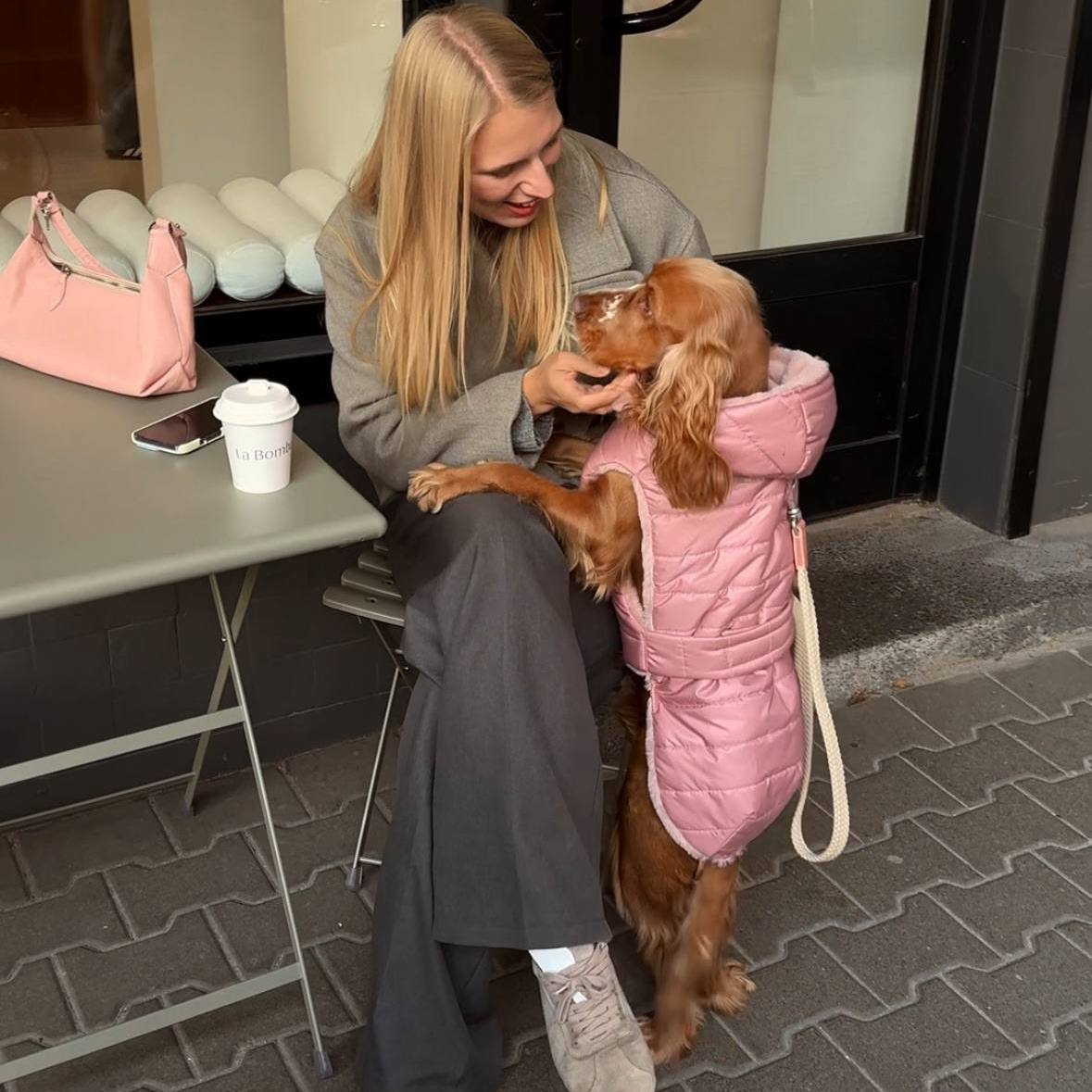Odpinany kaptur pozwala dopasować model do pogody, a starannie opracowany krój osłania brzuszek i klatkę piersiową. Na karku znajduje się dyskretne otwarcie, które pozwala przypiąć smycz do szelek lub obroży.