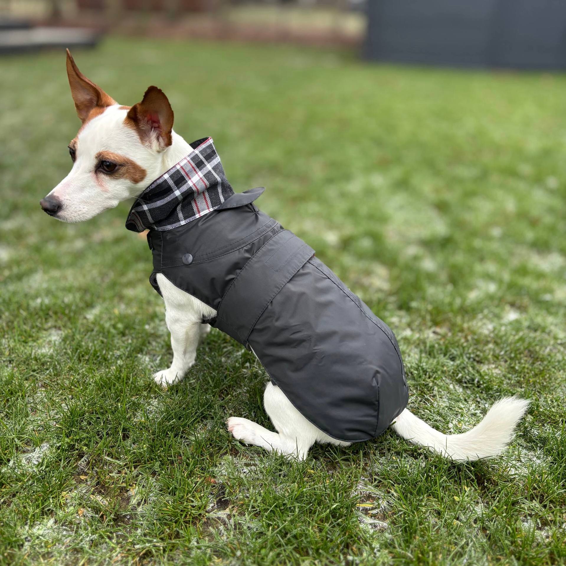 Stylowa podszewka w kratę dodaje mu charakteru, a starannie zaprojektowany krój chroni brzuszek i klatkę piersiową przed wilgocią. Na karku znajduje się dyskretne otwarcie, które umożliwia przypięcie smyczy do szelek lub obroży, a elastyczne gumki na tylne łapki stabilizują całość podczas spacerów.