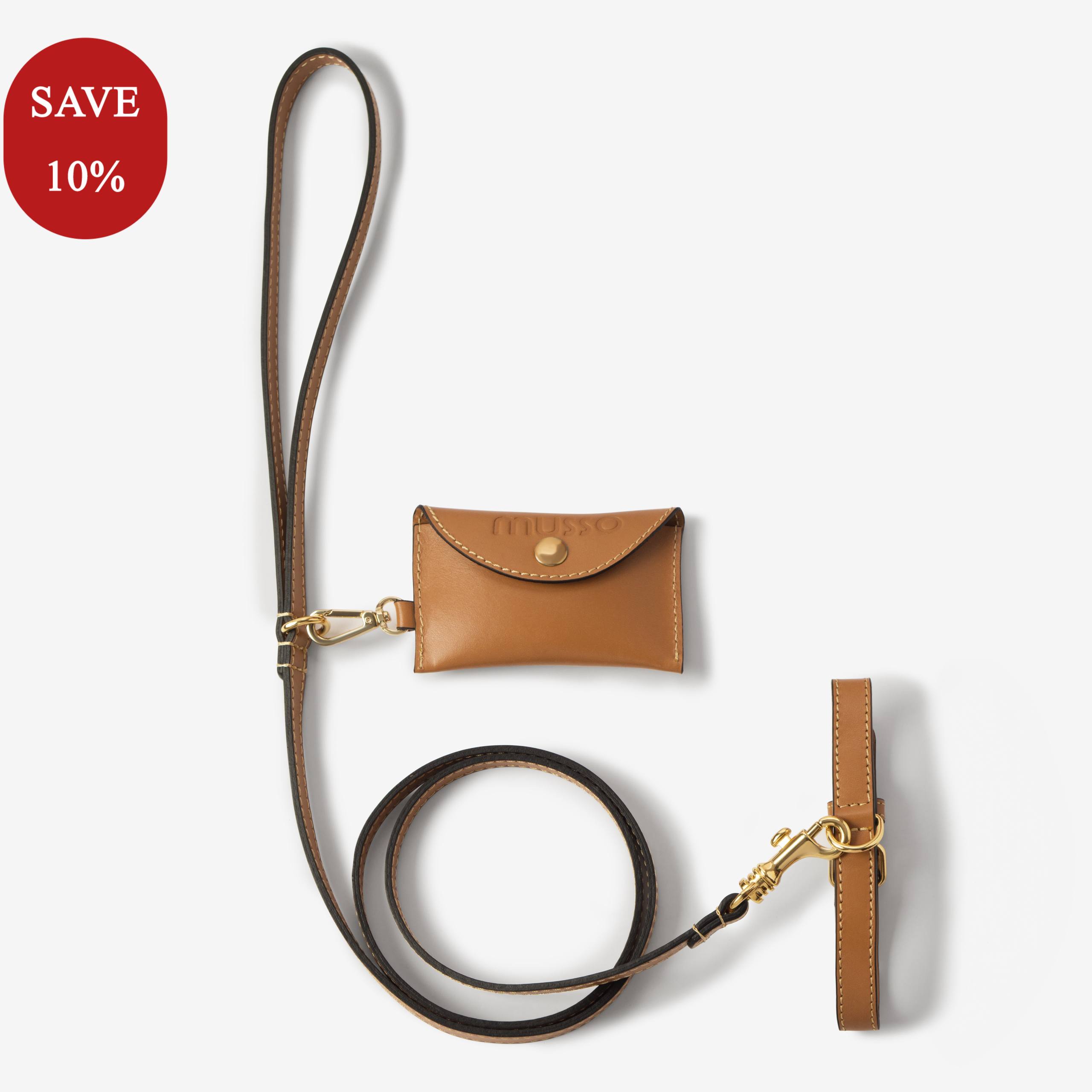Obroża, smycz i etui na woreczki w harmonijnym karmelowym tonie.