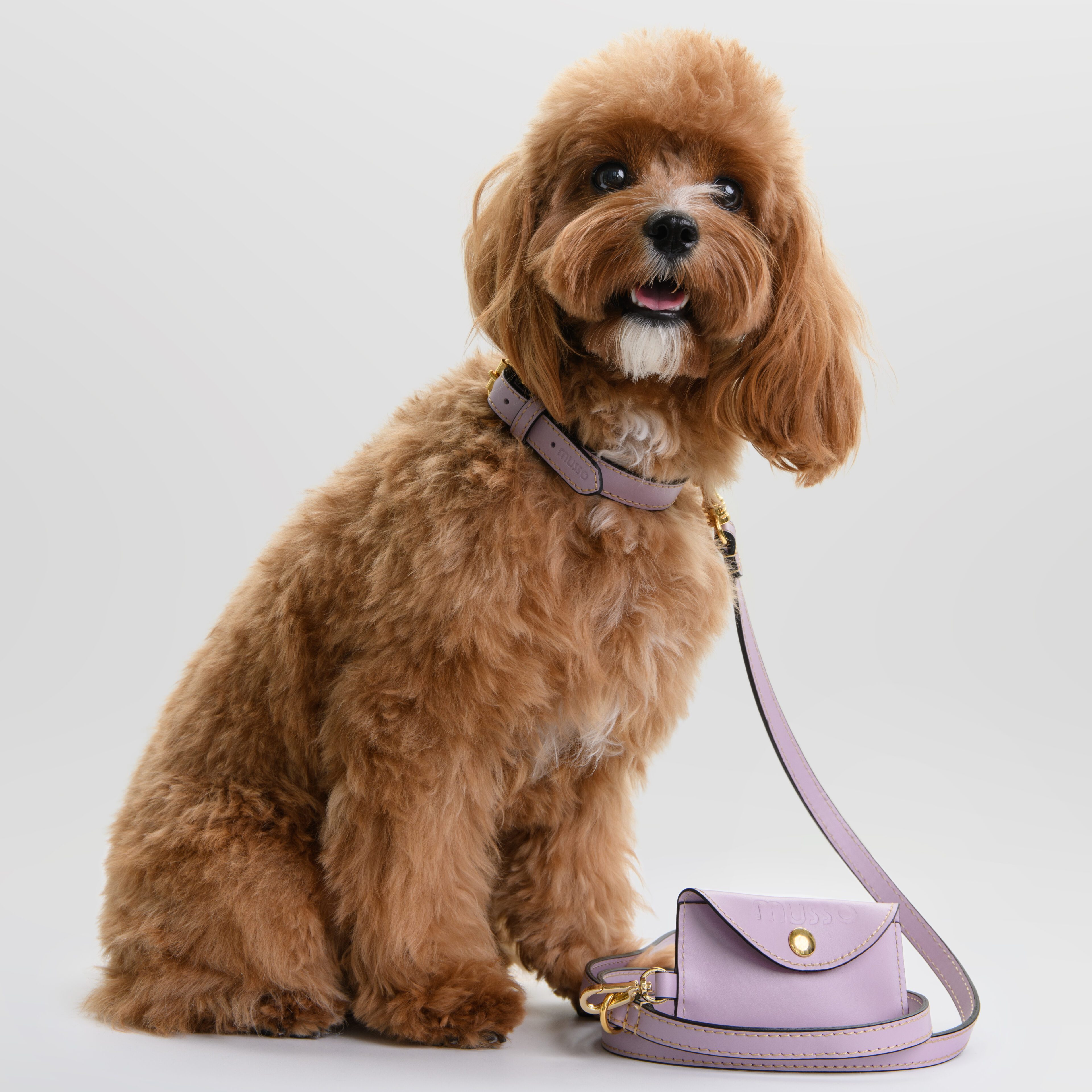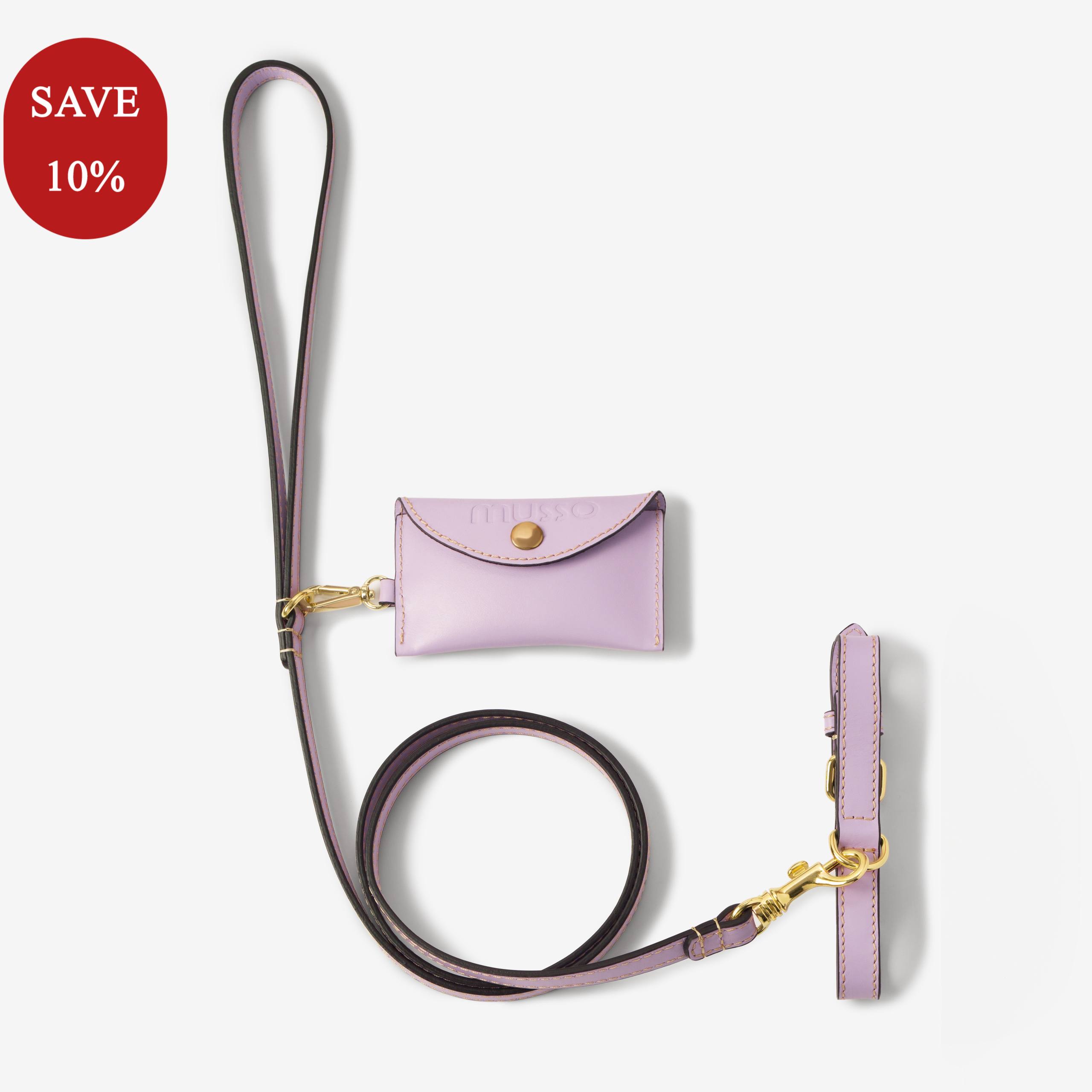Obroża, smycz i etui na woreczki w delikatnym odcieniu lawendy.