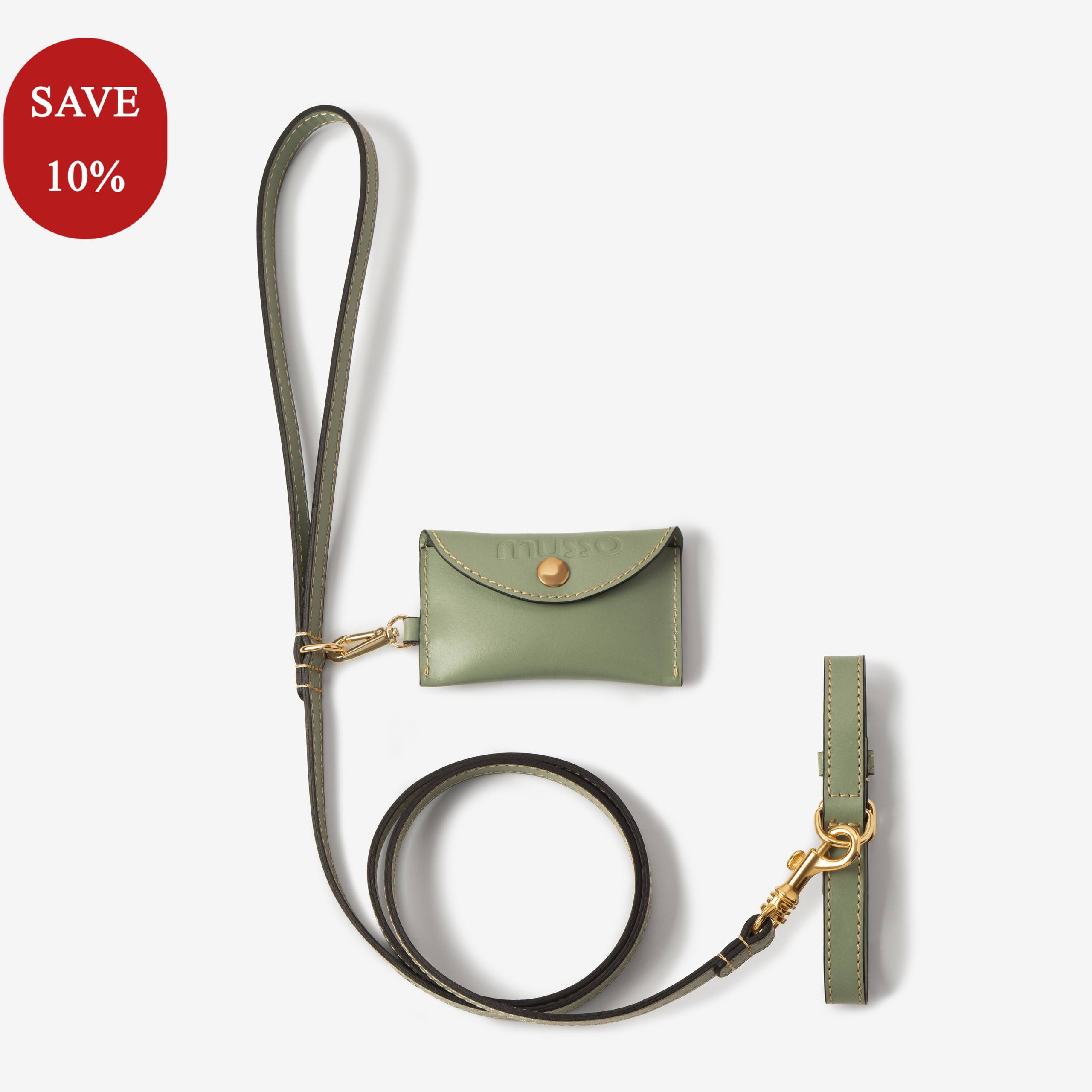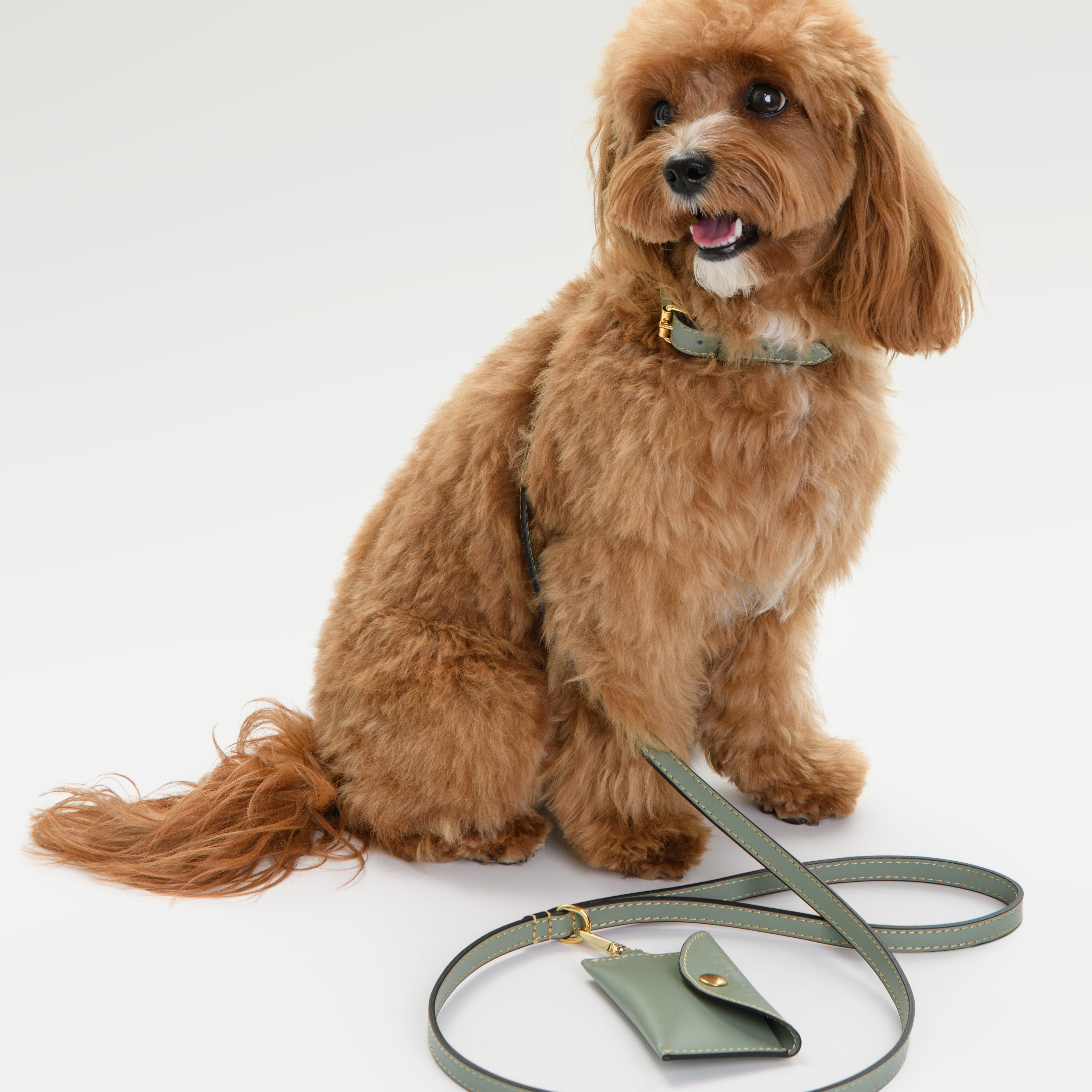 Obroża, smycz i etui na woreczki w ziołowym odcieniu szałwii.