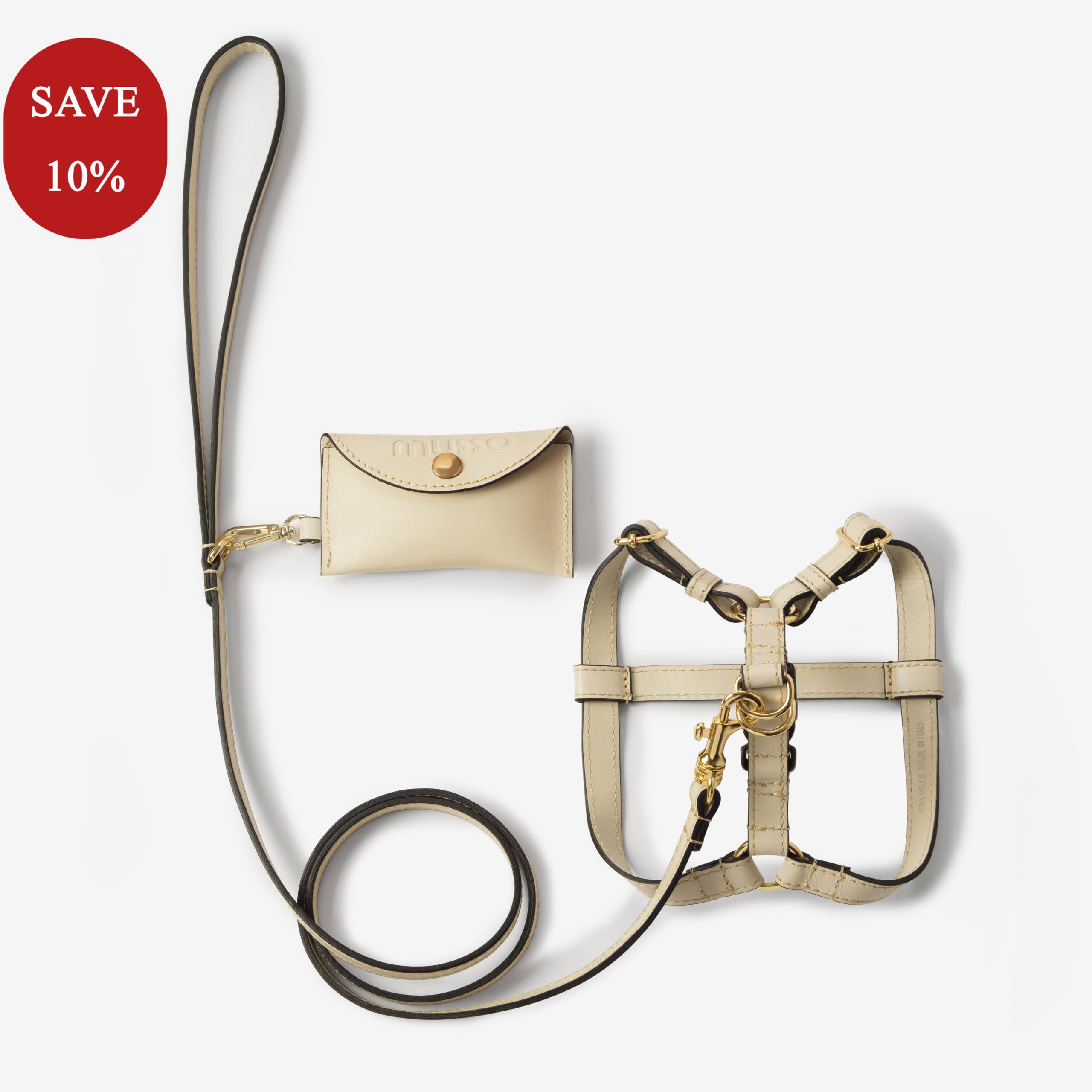 Zestaw Vero Crema to klasyczna propozycja w jasnej, naturalnej tonacji. Odcień kości słoniowej w połączeniu z jasnobeżowymi przeszyciami i złotymi, bezniklowymi okuciami tworzy spokojną, estetyczną całość — idealną na codzienne spacery.